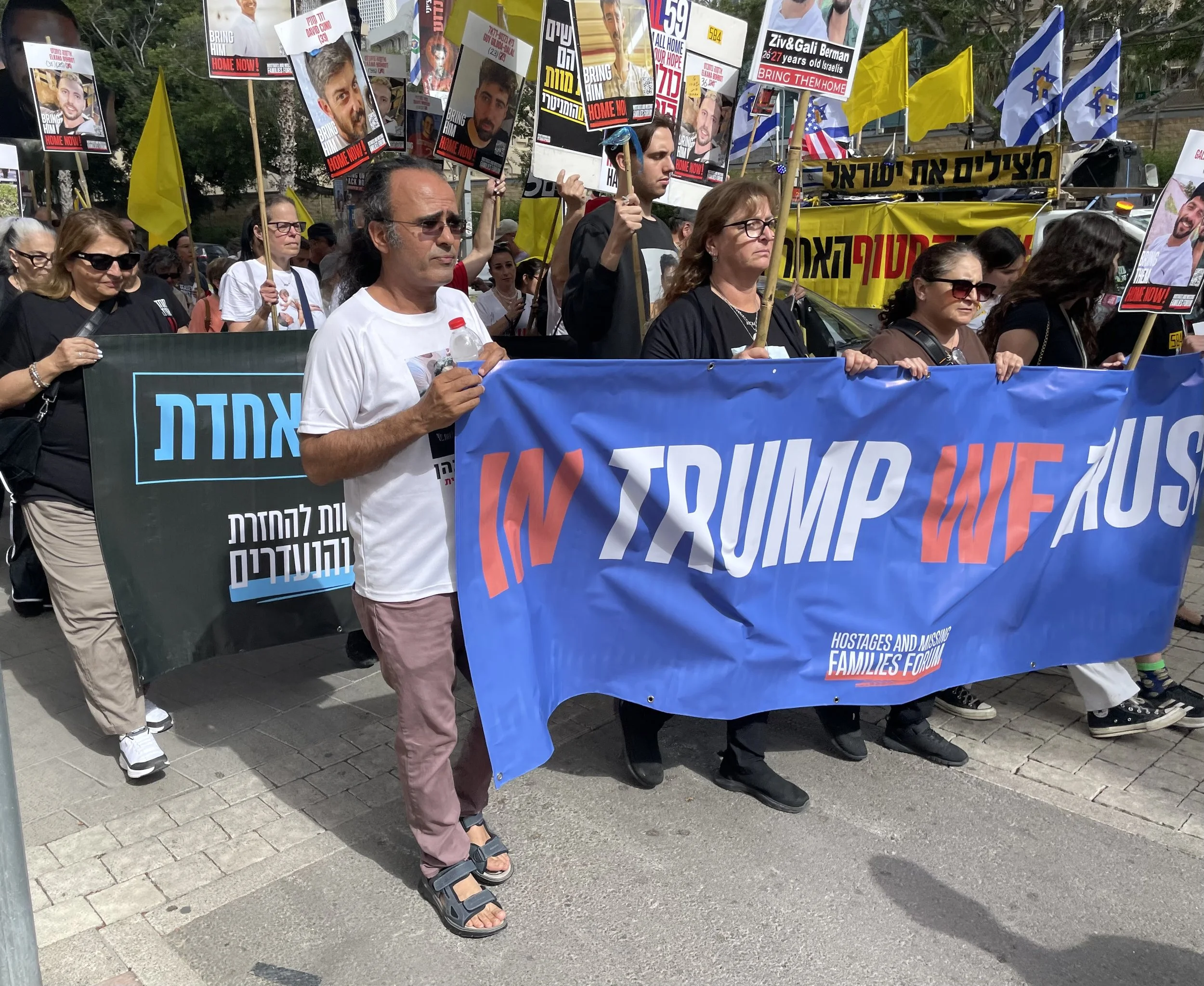 “In Trump we trust”. Oppositionella i Israel, som vill få bort Netanyahu, satte efter månader av förtvivlan sin lit till att president Trump kunde få ut den israeliska gisslan ur Gaza – vilket de visar här i en av många demonstrationer i Tel Aviv under försommaren 2025. Foto: Bitte Hammargren