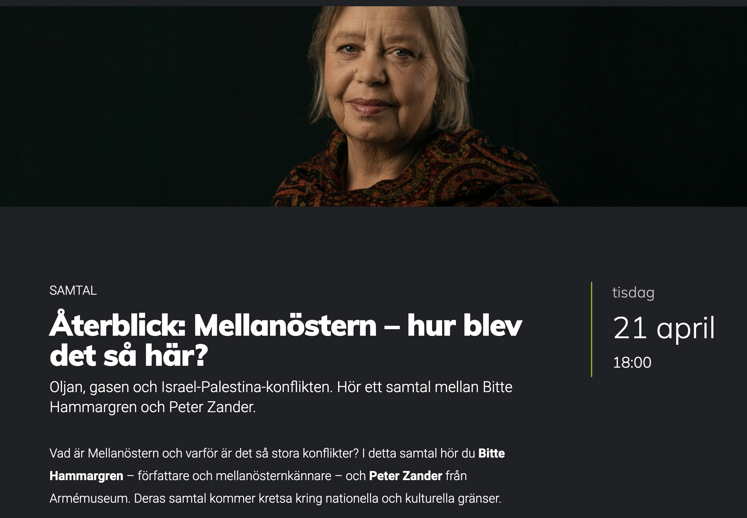 Törsten efter olja och gas – och de svåra följdverkningarna av den olösta Israel-Palestina-konflikten. Allt det här hänger samman på olika vis. Det vill jag tala om med Armémuseums Peter Zander den 21 april. Välkomna om ni kan! Länk till hela inbjudan här.