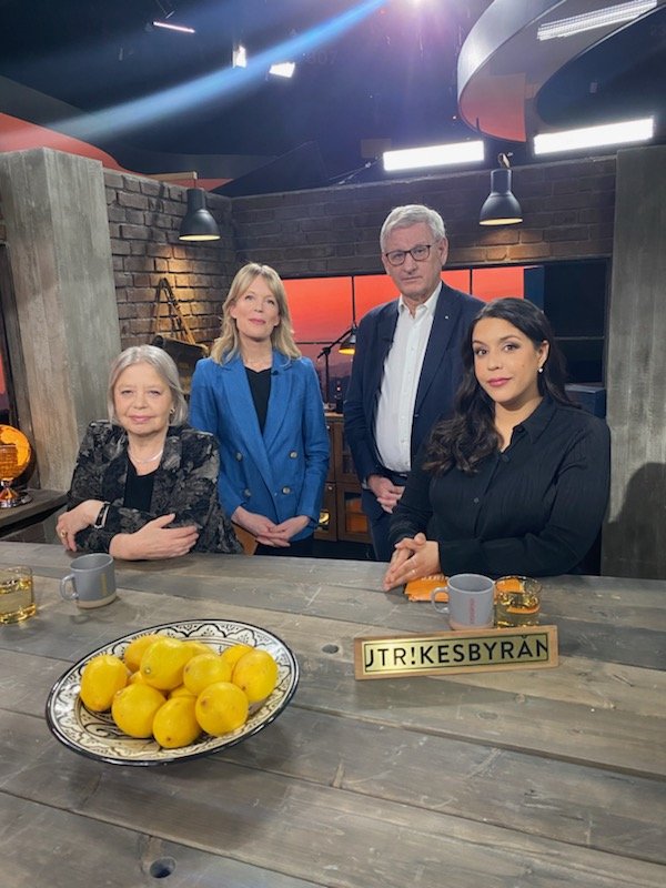SVT Utrikesbyrån för några år sedan, med programledare Rebecca Randhawa, Carl Bildt, Stena Blomgren och mig.